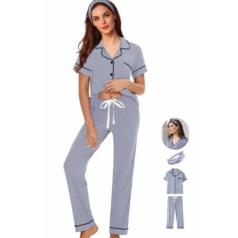 - 3PCS PAJAMAS SET FOR WOMEN: Comfy sets with headband for women featuring classic sleepwear style. Women's pjs sets comes with comfy short sleeves pajamas shirt, pajama drawstring full elastic waistband long lunge pants and one headband in matching color. Classical short sleeves long pants pajama sets, you can match this sleepwear in different ways to meet your needs all year around.