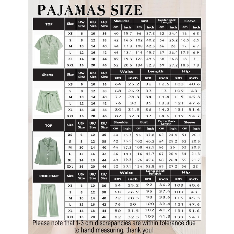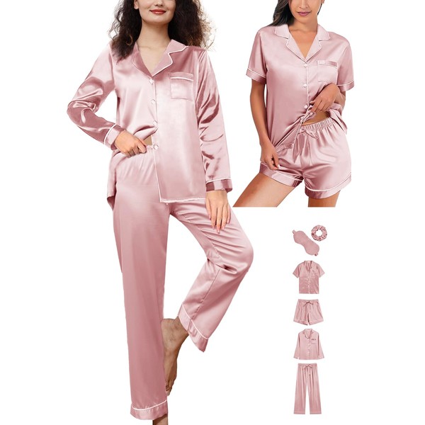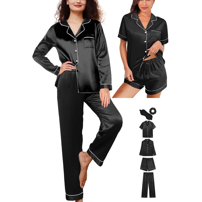 • Package Quantities-PLEASE NOTE TOTAL 6PCS PER PACK Include: 1xLong Sleeves Top, 1xShort Sleeves Top,1xLong Pant, 1xShorts, 1xEye Mask, 1xScrunchies. Please check carefully before order! Womens Satin Pajamas set silk pajama sets Pjs sleepwear Pj set Loungewear with sufficient quantity and elegant quality to satisfy the needs of you.