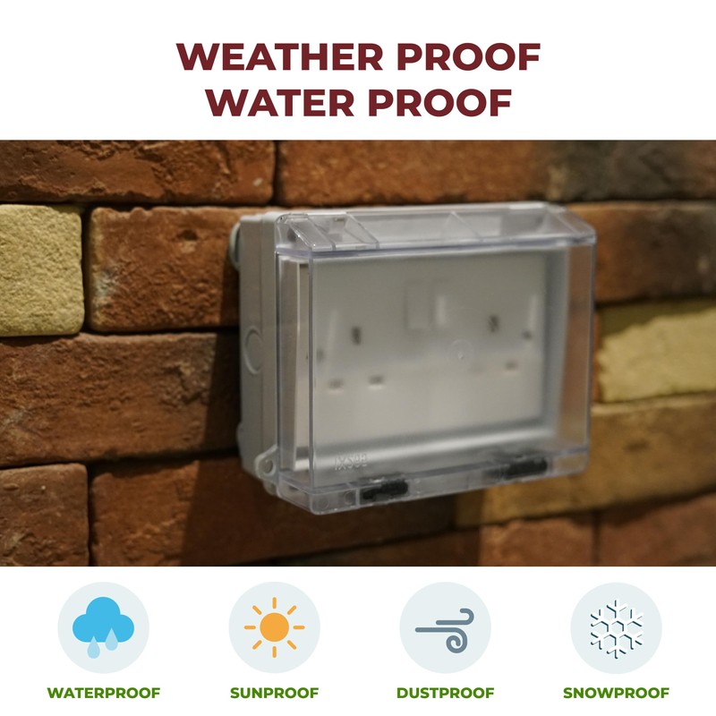 - Universal - This waterproof enclosure fits most of the Double sockets in UK market.