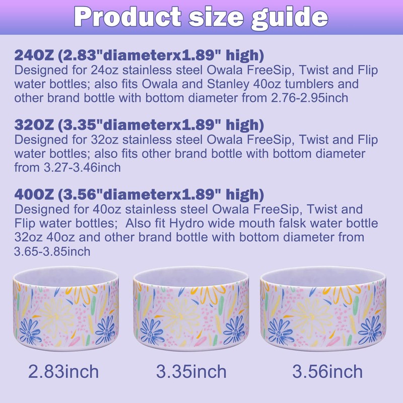 - 🌟【Easy to Install and Remove】Our protective silicone boot for Owala was designed with a small hole at the bottom for air outlet, supper easy to install. If you like our desings and want to try on your other brand water bottle of Hydro, Stanley, Simple modern...... pls do check your flask BOTTOM diameter to ensur the right size choice .Our flask/tumbler boot is a bit stretchable to fit the BOTTOM diameter from 3.27in-3.46in