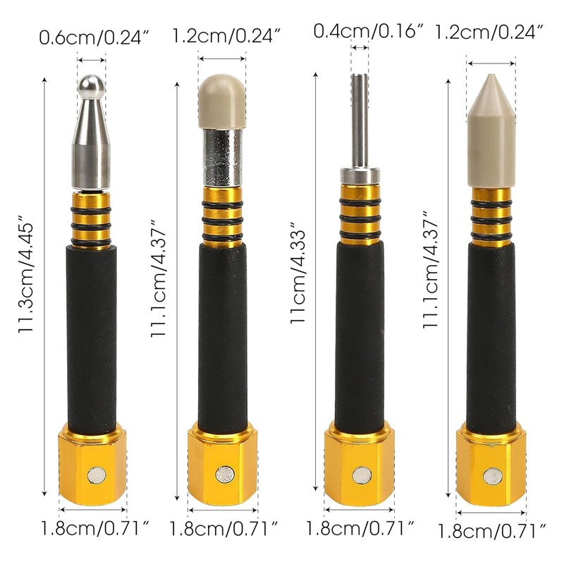 - Package & Size: Get one set including 4PCS x Pen Shape Dent Removal Tools with 4 types of heads. Length: 11 - 11.3cm. Width: 1.8cm. Each head size: As shown in the image. Thread Pitch: M6