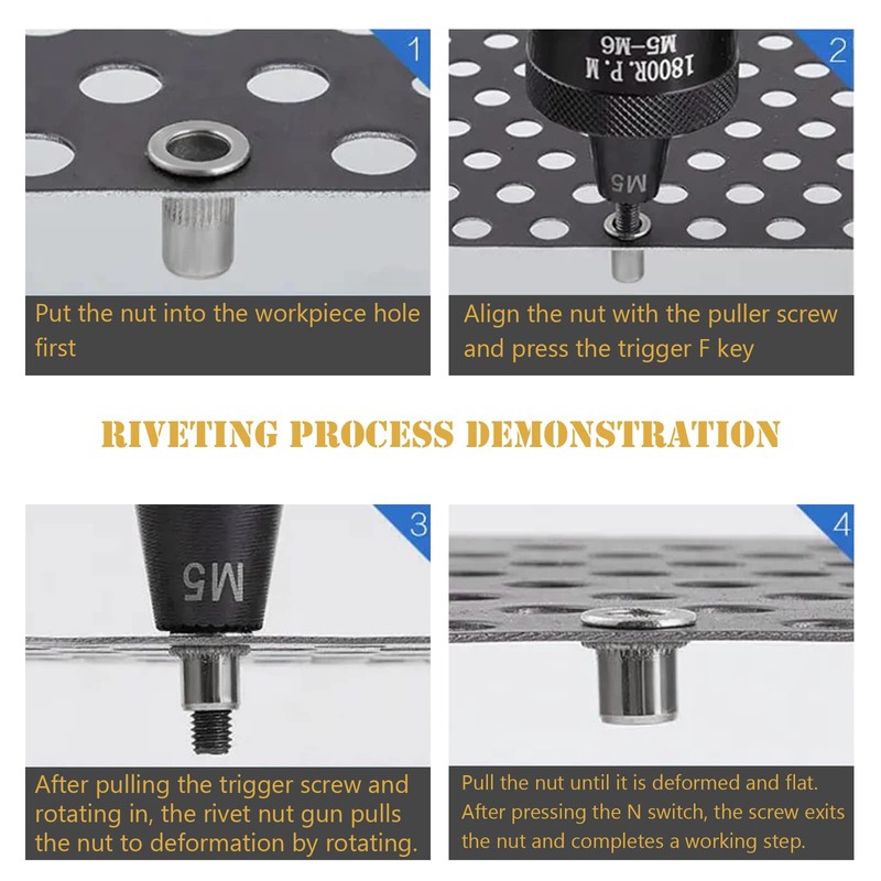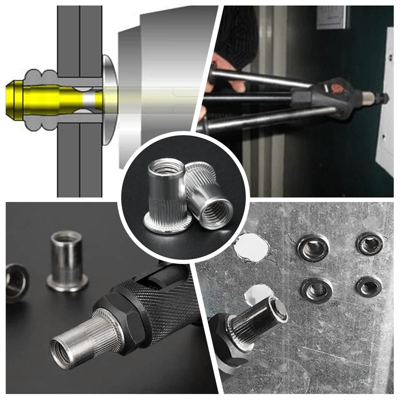 - Easy to install: the threaded rivet inserts are easy to install, have good friction and biting force and are easy to insert and fix the workpiece and connect the workpiece firmly. Simply drill a hole according to the size of the mounting hole of the rivet nut, insert the rivet nut and tighten the locking nut with the rivet tool.