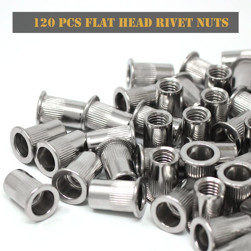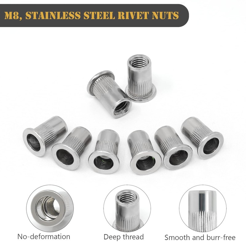 Wkmamo 120 Pcs M8 Rivet Nuts, 304 Stainless Steel Threaded Rivetnut Insert Nutsert, Flat Head Threaded Rivetnut Insert Rivnut Assortment Kit