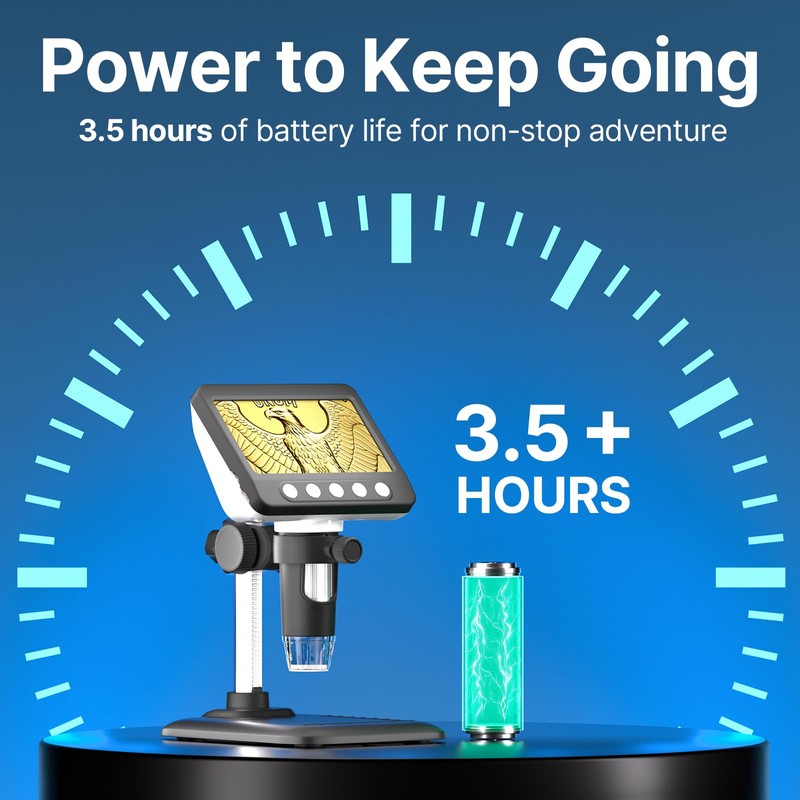 - Rechargeable Battery - WKR digital microscope is powered by a rechargeable battery (3.5 hours of working time) or directly via USB. Truly portable and independent. On a sunny day you can take your family or children to explore the magical and colorful miniature world.
