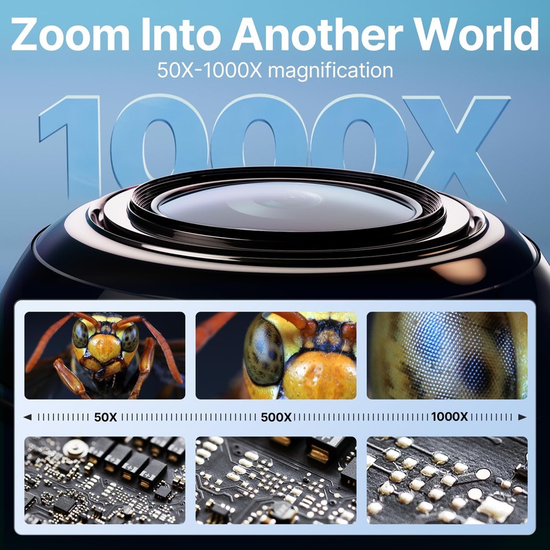 - 50X-1000X Magnification - allows to zoom in and see the incredible details of observations at a magnification range from 50X to 1000X. The actual magnification differs due to the screen size, the distance between the camera, and the observations.
