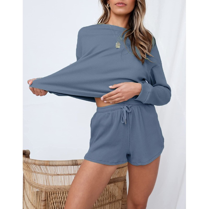wkwmrpet Women's Waffle Knit Long Sleeve Top and Shorts Pullover Nightwear Lounge Pajama Set with Pockets
