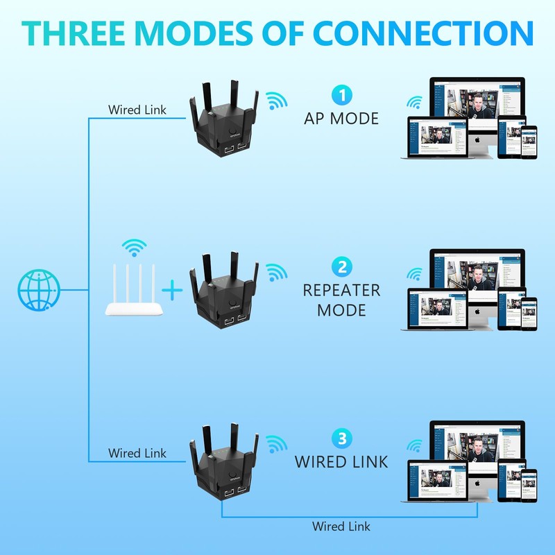• 📶【Vielfältige Anwendungsmöglichkeiten】 Der WiFi Extender unterstützt verschiedene Betriebsmodi wie Repeater-, AP- und Router-Modus. Der Repeater-Modus erweitert das Netzwerk, während der AP-Modus kabelgebundene Verbindungen in kabellose Signale umwandelt und der Router-Modus als eigenständiger Router fungiert, um ein separates WLAN-Netzwerk zu erstellen.