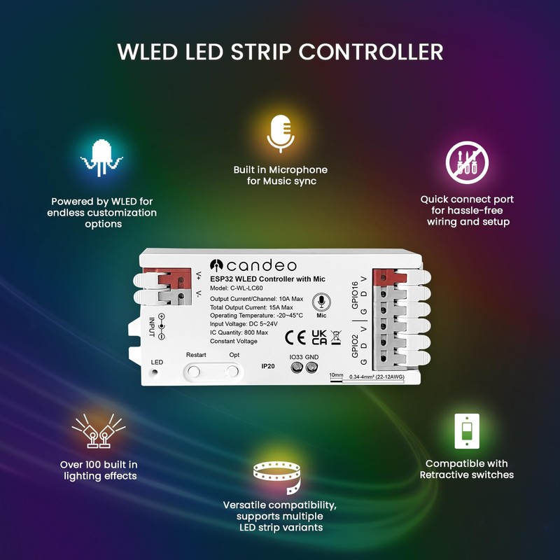 Our Smart LED Strip Controller is designed to revolutionize your lighting experience. It offers over 100 dynamic RGBIC lighting effects, all easily customizable via the intuitive WLED app. The built-in microphone syncs your lights to the beat of your music, creating an immersive atmosphere for any occasion, whether it’s a party, a movie night, or just a relaxing evening at home.
