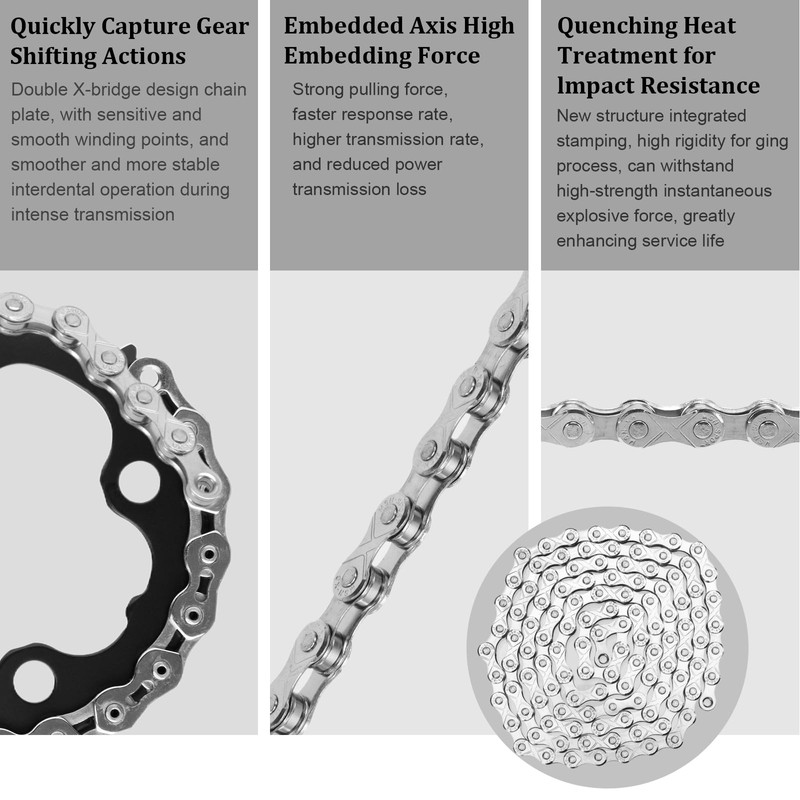 - 【Double-X bridge frame design】 Our bicycle chain adopts Double-X bridge frame design, which makes the chain contact points more sensitive, can quickly detect gear changes, and runs more smoothly and stably. In addition, the built-in shaft of the bicycle chain has high embedding force, strong tensile force, faster response speed, higher transmission rate, and reduced power transmission loss.