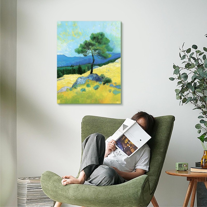 - 【Peaceful Pine Tree on a Hillside】: The first framed print showcases a tranquil pine tree on a hillside. The soft pastel colors and delicate brushstrokes evoke a sense of tranquility, making it an ideal addition to any calming space. This framed canvas print complements various decor styles, including colorful wall art and Scandinavian artistic styles.