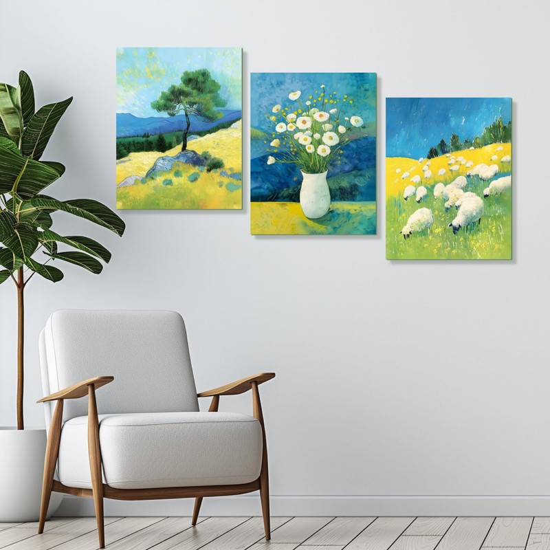 WLHARTT Vincent Van Gogh Wheat Field With Pine Sheep Wall Art Impressionist Nature Style Oil Painting Wall Decor Fresh Landscape Field Canvas Prints for Living Room Bedroom Framed 16"x24" Set of 3