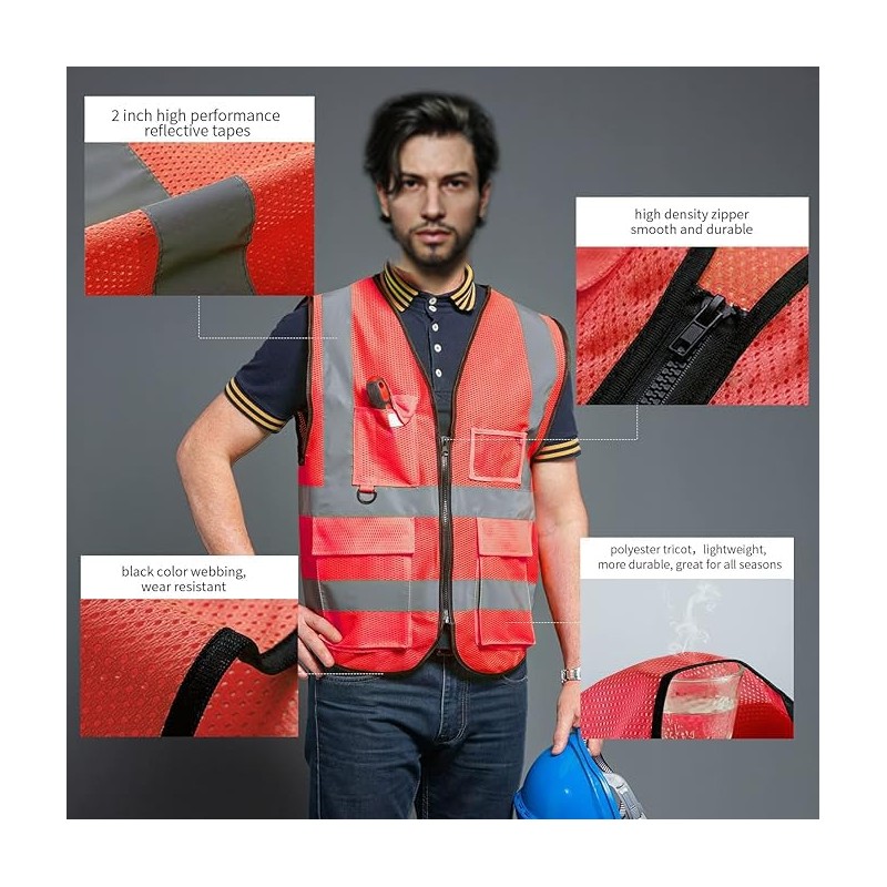 WLHGH Safety Vest, Highly Visible, Reflective, Unisex, High Visibility Vest for Work, Street and Night with Zip, Neon red (mesh), L
