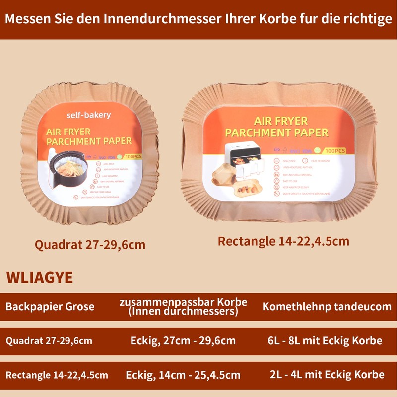 - Heat resistant and non-leak-proof: WLIAGYE hot air fryers baking paper is heat resistant up to 220 degrees Celsius and can be used in hot air fryers, conventional ovens and microwave ovens. WLIAGYE baking paper is thicker than normal hot air fryer paper or inserts, so it does not crack or leak when used in a hot air fryer.
