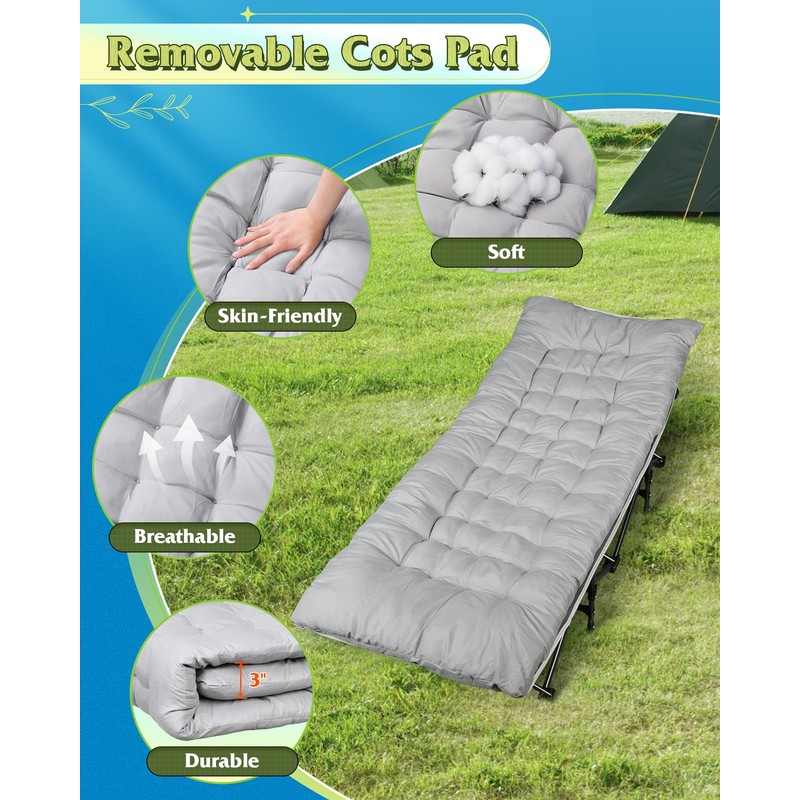 - 【Durable & Breathable】The camping cot's double-layer 1200D Oxford fabric resists spills and dries quickly, while the removable 3-inch mattress offers breathable comfort for restful sleep.