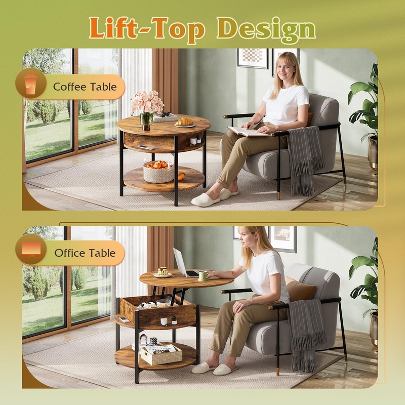 Meet the ultimate upgrade for your living space: our round lift-top coffee table masterfully blends modern farmhouse charm with brilliant functionality. This isn't just another living room table; it's a versatile centerpiece designed for modern life. The innovative adjustable lifting mechanism allows you to effortlessly raise the top to a perfect height for working on your laptop, dining, or simply enjoying your morning coffee. Crafted for practicality, this small coffee table is a storage powerhouse. Beyond the lift-top, it features a hidden compartment and a lower shelf, offering multiple solutions to keep your space organized and clutter-free—a true blessing for any home. Built to last, its sturdy construction combines a strong metal frame with high-density engineered wood, topped with a scratch-resistant and waterproof surface that stands up to daily life and protects against spills. The safety-friendly circular design eliminates sharp corners, making it a secure choice for households with children and pets. Easily move it from your living room to your home office or bedroom. Complete with clear instructions, assembly is a quick and hassle-free process. Discover the perfect blend of style, storage, and safety with this exceptional modern coffee table.