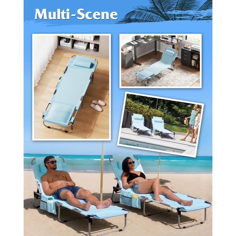 - 【Versatile Comfort】The foldable outdoor tanning chair customize your comfort with 5 adjustable positions, each designed using ergonomic principles. Secure locking mechanisms provide safe, worry-free positioning at any angle.