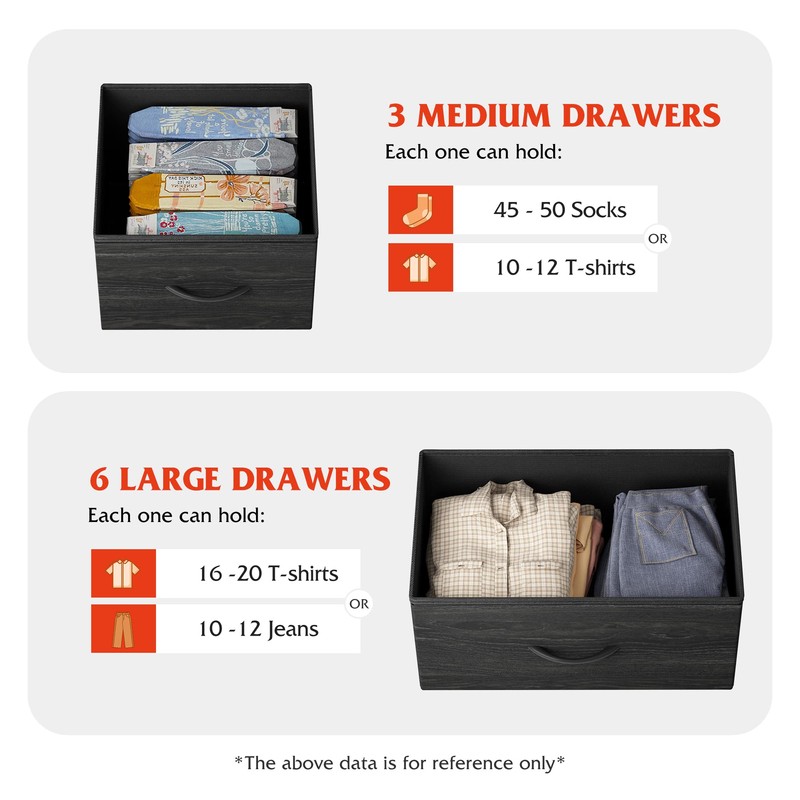 - Roomy Storage Space: The 9 foldable deep drawers are so spacious that they provide endless organizational possibilities. Wooden top is great for lamps, clocks, glasses and other daily essentials, keeping them in your reach.