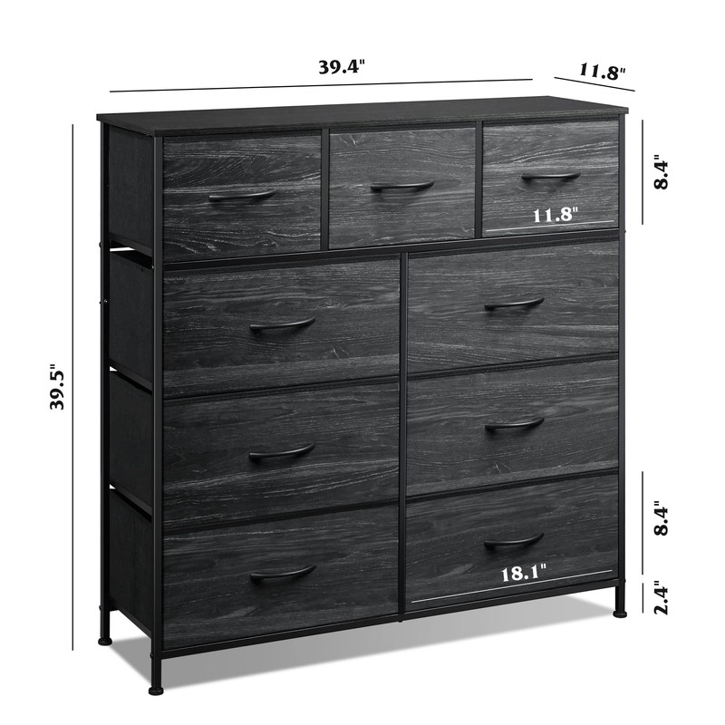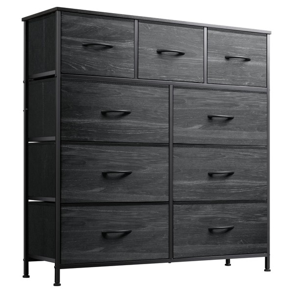 WLIVE 9-Drawer Dresser, Fabric Storage Tower for Bedroom, Hallway, Nursery, Closet, Tall Chest Organizer Unit with Bins, Steel Frame, Wood Top, Easy Pull Handle, Charcoal Black Wood Grain Print