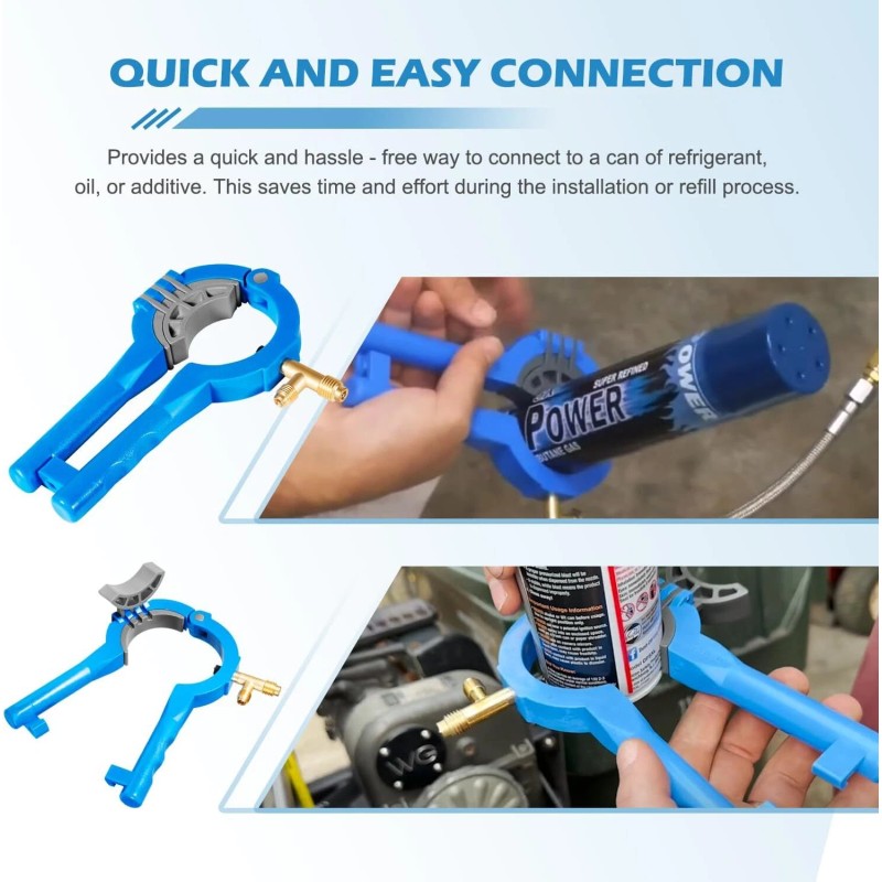 - 【Quick and easy connection】Provides a quick and hassle-free way to connect to a can, oil, or additive. This saves time and effort during the installation or refill process of automotive air conditioning systems. The user can easily attach the tool to the appropriate can and start the transfer of the required substance without the need for complex setup or procedures.