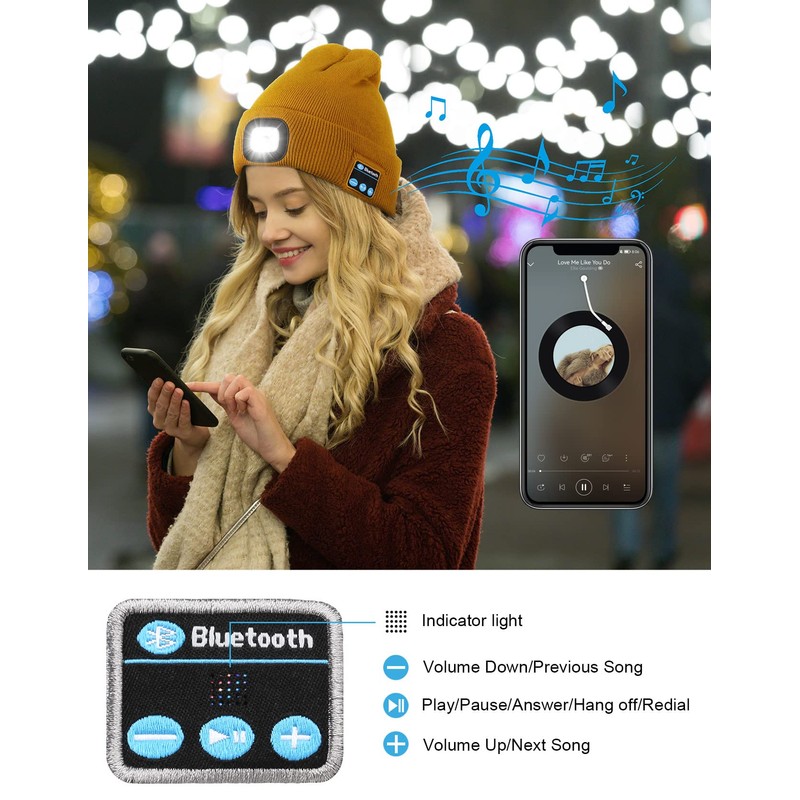 Fashion Bluetooth beanie with LED light make you enjoy music comfortably while keep warming and light your way wherever you go.Bluetooth Beanie cap with light is a perfect winter gift for Birthday, Thanksgiving, Christmas and other anniversary, it's the best gifts for men, dad, him, women, mom, her and more.Features:- Fashion,stylish and warm wireless bluetooth beanie ,keep your head ear warm, and allows you to listen music without wearing additional headphones.-Catch Calls while on the run using the hands-free mic, light your way using the hands-free light.-Dynamic HD stereo headphones with terrific sound-Play time up to 5-6 hours and led light working time up to 2-8 hours without needing a charge-One size fits most, Stretchable material for comfortability and maximum fitness.-Effective range up to 33ft with free line of sight.Specifiactions:-Light Source: 4 LEDs-Bluetooth Version: V5.0-Size: one size fits most-Material: 100% soft acrylic-Dimension: 8.6x7.9 inch-Weight: 0.27 bl-Transmission Distance: 10m/33feet-Standby Time: up to 48 hours-Charging time: 1.5 hours