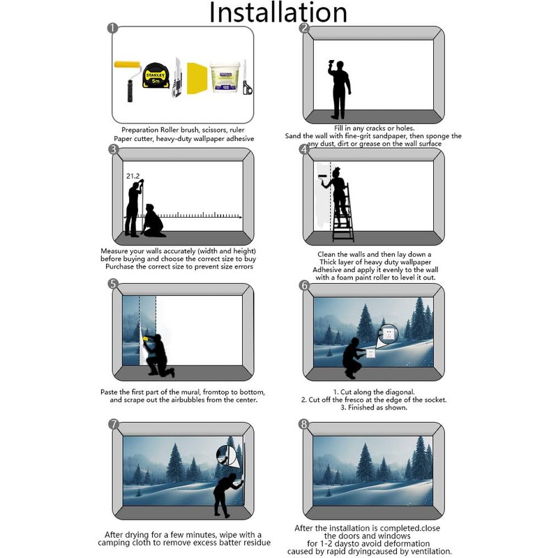 - Installation steps 1. Fill in any cracks or holes and clean the surface of the wall of dust, dirt and grease.2. Apply heavy-duty wallpaper paste to the wall, not the mural.3. Mark the position of each strip of wallpaper with a spirit level.4. Align the pattern and slide it into place.5. Scrape the bubbles with a spatula.6. Let it dry for a couple of minutes and it's ready to go!