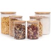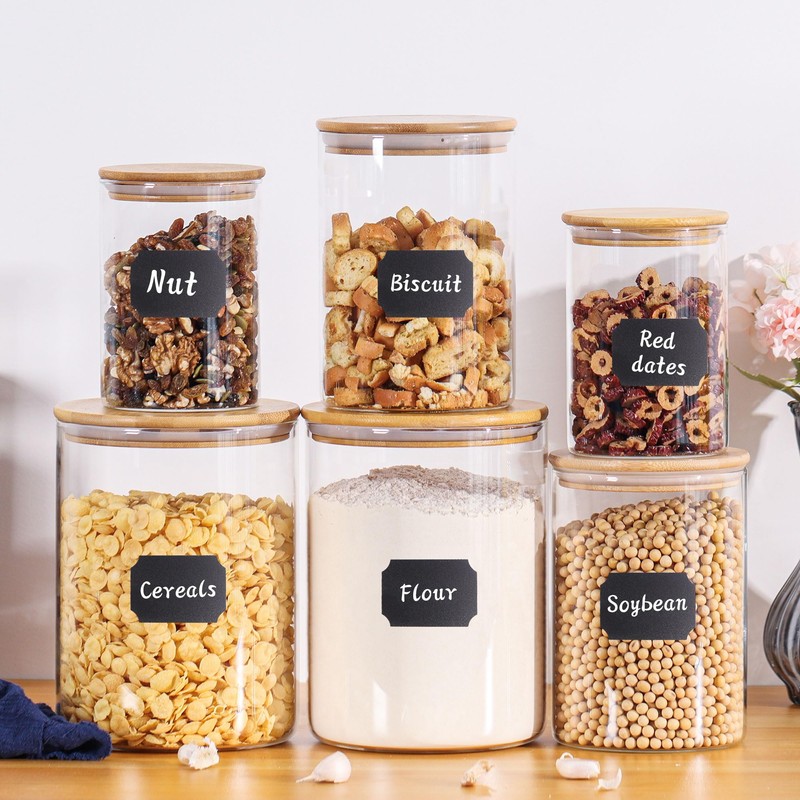 - 【AIRTIGHT STORAGE WITH STYLE】 This set of 6 glass storage containers features bamboo lids with airtight seals, keeping your food fresh longer. Whether you’re storing sugar, pasta, rice, tea, spices, oats, or nuts, these clear glass jars combine functionality with style. The bamboo lids add a natural, rustic touch to your kitchen or pantry, while the included labels help you stay organized