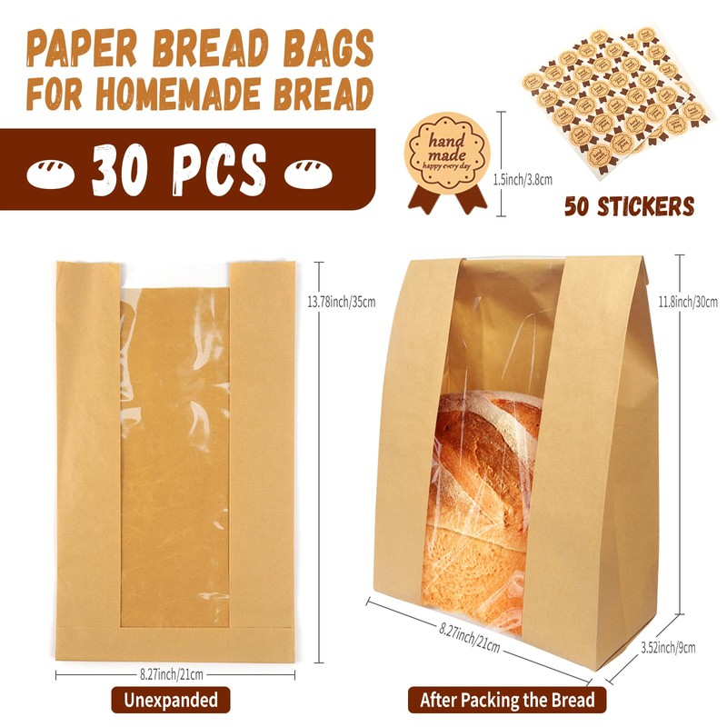 Specifications:Size: 13.78 x 8.27 x 3.52 inchesMaterial: High-quality, food-safe kraft paper with a clear plastic windowIncluded: 30 Pack Bread Bags & 50 Pcs Seal StickersFeatures:- Clear Viewing Window: Quickly identify what's inside without opening the bag, making organization and presentation a breeze.- Moisture and Grease-Resistant Interior: Keeps baked goods fresh by effectively preventing moisture loss and protecting against oil stains.- Self-Standing Design:The square bottom allows The bag to stand on its own,simplifying The packing process and improving product display.- Versatile Use: Ideal for a wide range of uses, from home baking to professional bakery settings, and perfect for food gifting at various events.- Decorative and Functional Stickers: Enhance your packaging with our beautifully designed seal label stickers that also ensure freshness.How to Use:1. Place your baked goods inside the bag.2. Use the seal label stickers to securely close the bag.3. If gifting, personalize the sticker or add a ribbon for a festive touch.4. To display, simply open the bag and let it stand on its square bottom.Warm Tips:- While the bags are moisture and grease-resistant, it's recommended to cool any hot baked goods before packaging to maintain optimal freshness.- The clear window is a great way to showcase your goods, but consider the placement of your items inside the bag for the best presentation.- Our bags are designed for single use, but by handling them with care, you can maximize their lifespan and presentation value.With these Paper Bread Loaf Bags, packaging, presenting, and gifting your baked creations have never been easier or more stylish.Elevate your baking and gifting game with bags that combine functionality with aesthetic appeal, making every loaf, pastry, or treat a delight to give and receive.