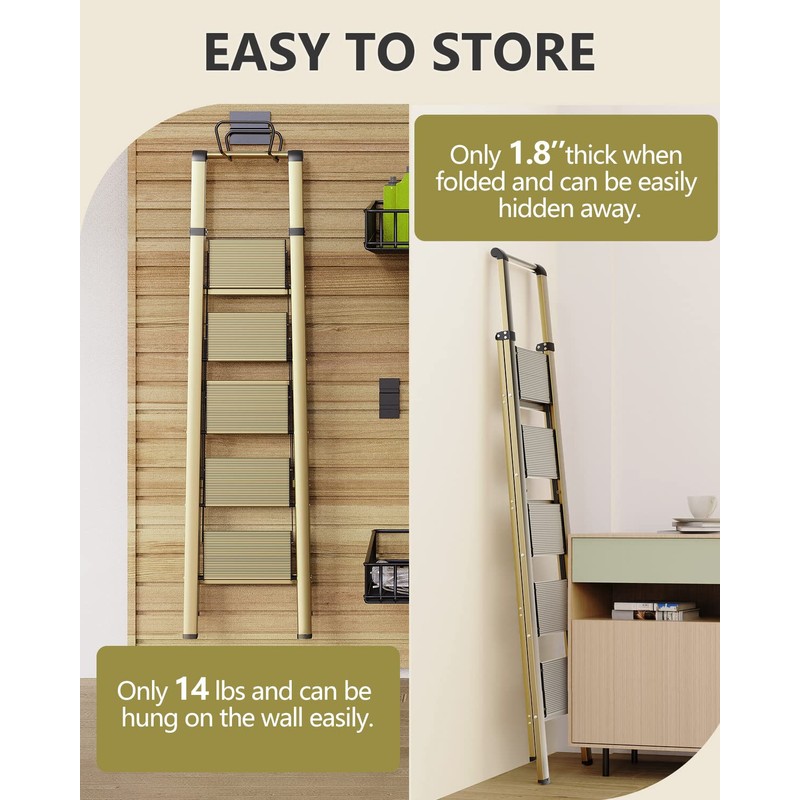 WOA WOA 5 Step Ladder, Folding Ladder with Anti-Slip Wide Pedal, Portable Folding Step Ladder with Convenient Handgrip, Lightweight Aluminum Stepladder for Home, Office, Library - Gold