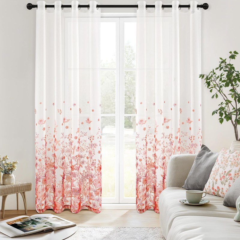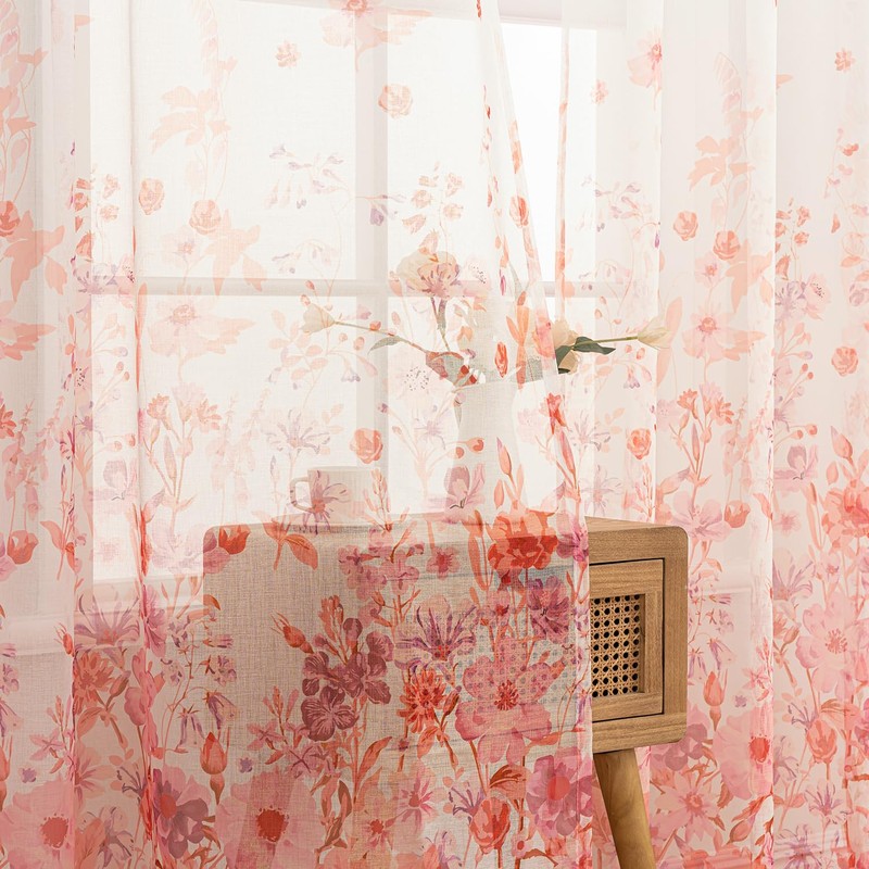 Woaboy Curtains Pink Voile Floral Pattern Curtains with Eyelets Living Room Transparent Eyelet Curtain Sheer Voile Curtains for Bedroom Set of 2 140 x 245 cm (W x H)