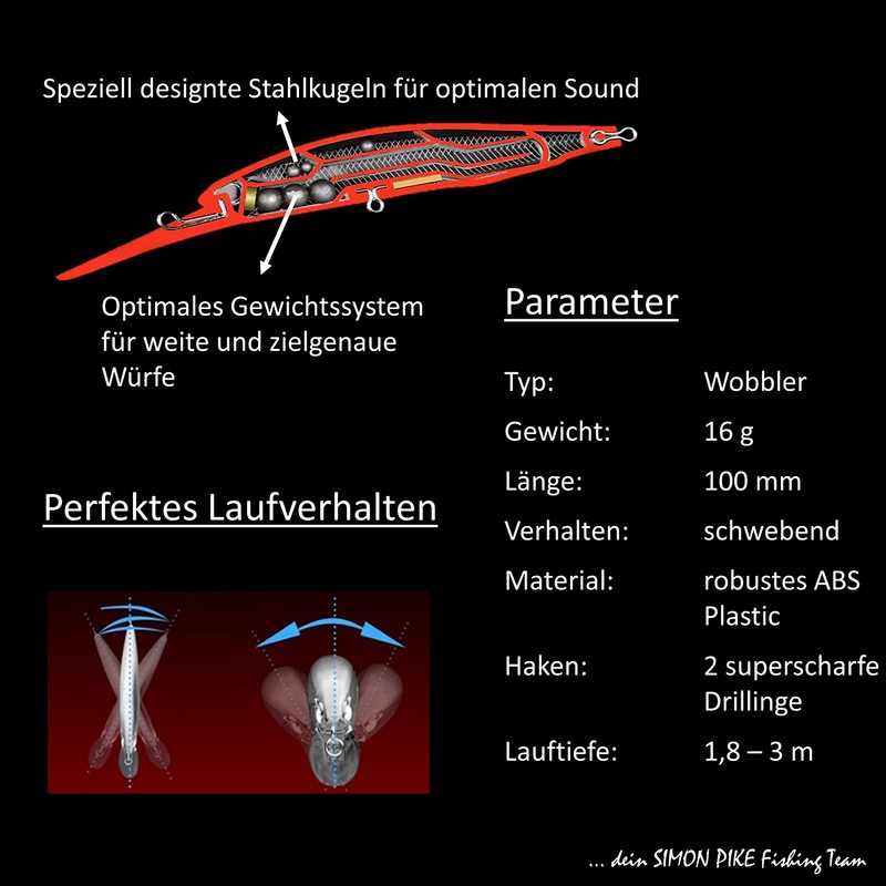 - Wobbler running properties: suspend, floating | diving depth: 1.8-3 m | weight: 16 g | length: 10 cm