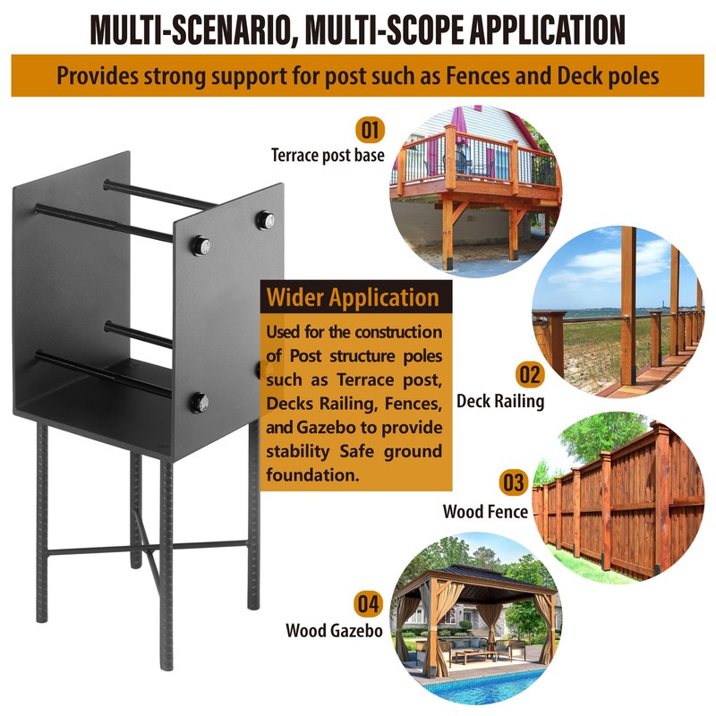 - SCOPE OF APPLICATION: U-shaped fence post base separates the wooden post from the wet concrete, Reduces the risk of moisture damage to the wood, Makes the wooden post more stable and has a longer service life. It can be used as a connection between wooden post foundations of Terrace psotbase, Wood Gazebo, pergola, Fences, Deck railings, etc., And wet-laid concrete foundations
