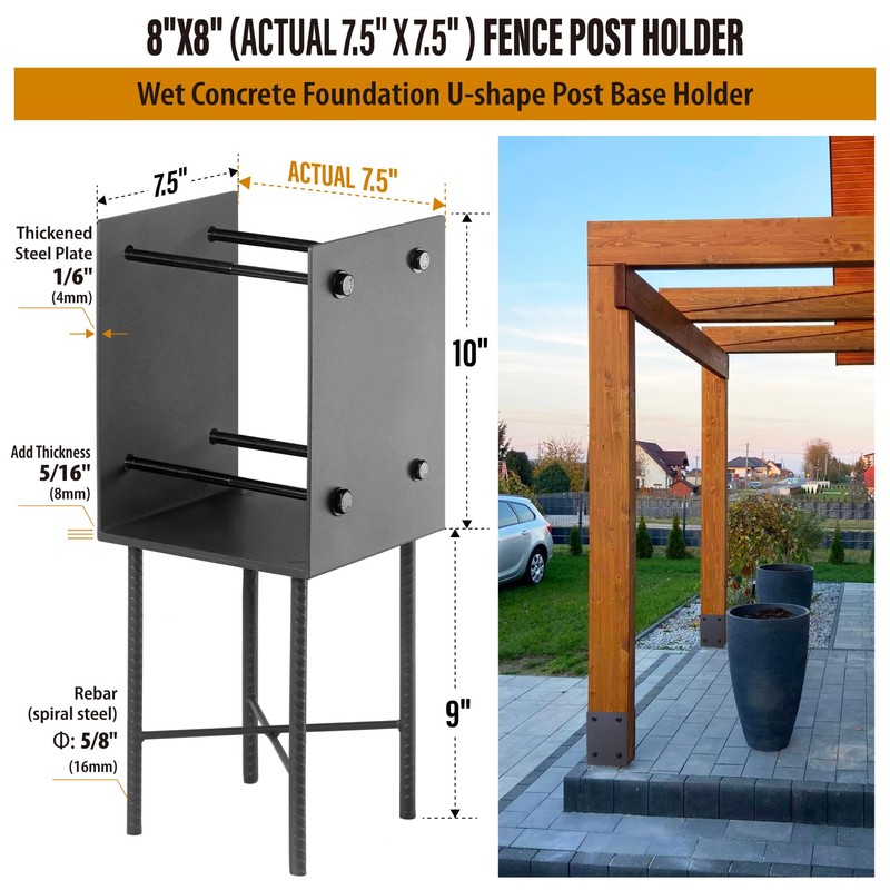 Wocepu 1 Pack Heavy Duty Stainless Steels U-Shape 8"x8"(Actually 7.5"x7.5") Wet Concrete Fence Post Holder, Psot Base, for Fence, Deck Railing, Pergola Wood Post Bracket Anchor (Dark Grey)