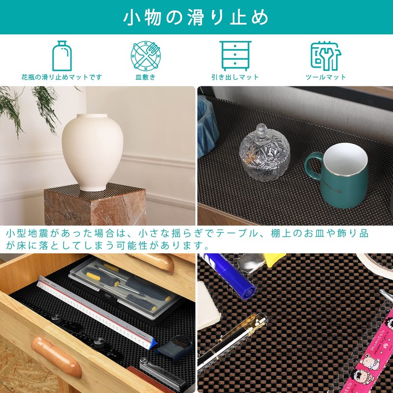 - Strong Anti-Slip Sheet: The anti-slip sheet has excellent anti-slip properties. If there is a weak earthquake, a small sway can cause dishes and ornaments to fall on the floor, especially on glass products. The use of non-slip sheet prevents items from falling out and increases safety. It can also be placed under heavy furniture such as beds, sofas, refrigerators, and other appliances to prevent slippage and vibration
