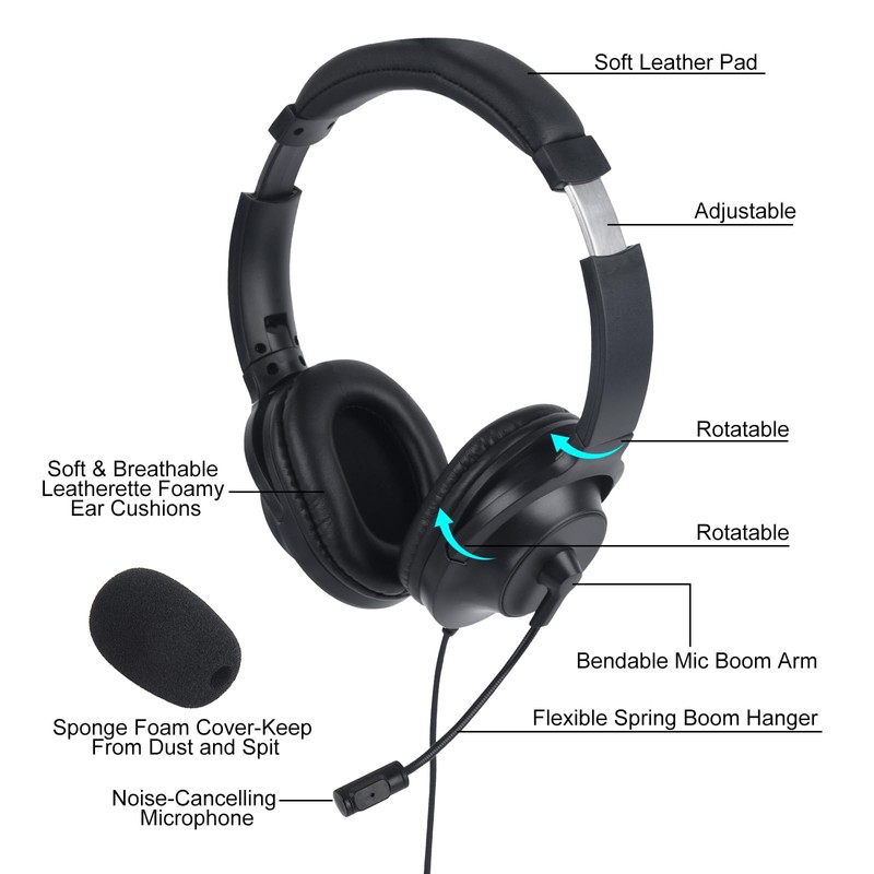 - 【Comfortable Ear Pads】Made of skin-friendly and breathable leather material, the soft sponge-filling inside dual earmuffs ensure you a wonderful comfort to wear for a long time, which would not get ear hurt easily even use the overhead headphone all day. With 90° inward rotation foldable design, both ear-pads of the noise reduction headset can fold together for easy storage to carry.