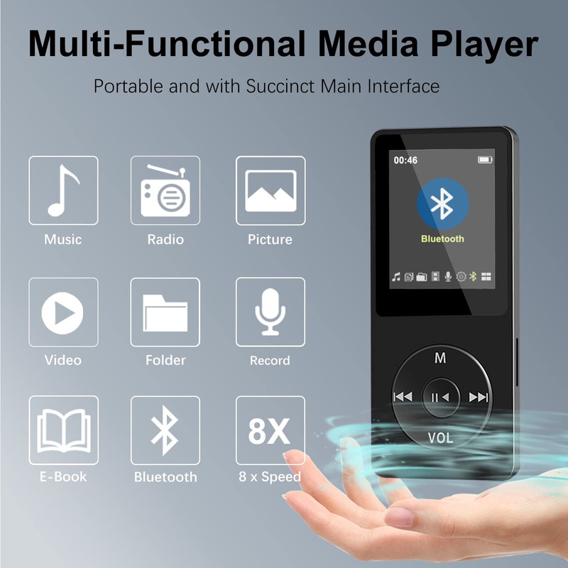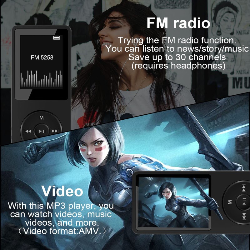 - Multi-functional MP3 - This portable MP3 music player not only play music, it supports many function such as: Video, FM Radio, Voice Recording, E-book, Photo, etc. Perfect for outdoor, gym fitness, and entertainment.