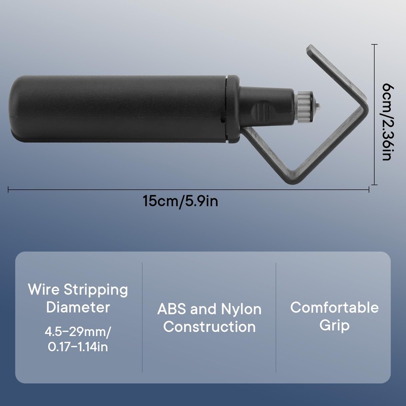 1. HIGH HARDNESS BLADE: The blade of the cable stripper is made of tool steel, featuring high hardness, wear resistant, and a long lifespan, allowing for easy stripping and cutting of cables. 2. ADJUSTABLE DESIGN: Featuring a spring loaded cable clamp, adjustable, this tool securely grips various cable sizes, providing stability to the blade for accurate cutting. 3. COMFORTABLE GRIP: The cable stripper’s handle is made from engineering nylon, sturdy and smooth providing a comfortable grip and convenient portability. 4. MULTIPURPOSE: With three cutting tracks, you can cut optic cable sheath horizontally or vertically, as well as rotate for stripping, offering flexibility for different tasks. 5. COMPACT DESIGN: Measuring approximately 14 cm in length and 2.8 cm in handle diameter, this cable stripper is lightweight and portable, making it easy to carry and store. Specification: Item Type: Cable Stripper Color: Black Handle Material: Engineering Nylon Blade Material: Tool Steel Stripping Diameter: Approx. 19-40mm / 0.75-1.57in Usage: Cable Stripping, Skin Stripping, Wire Cutting Three Cutting Paths: Horizontal Circular Cut, Longitudinal Cut, Rotation Cut Package List: 1 x Cable Stripper