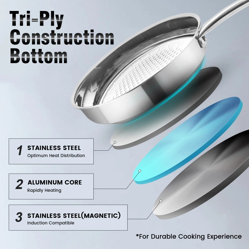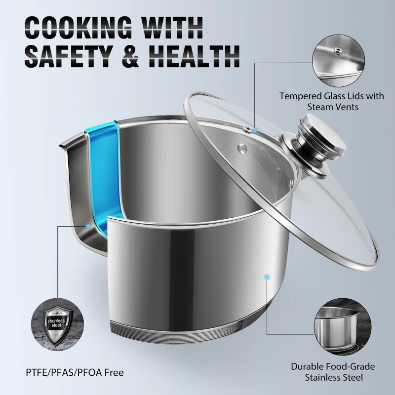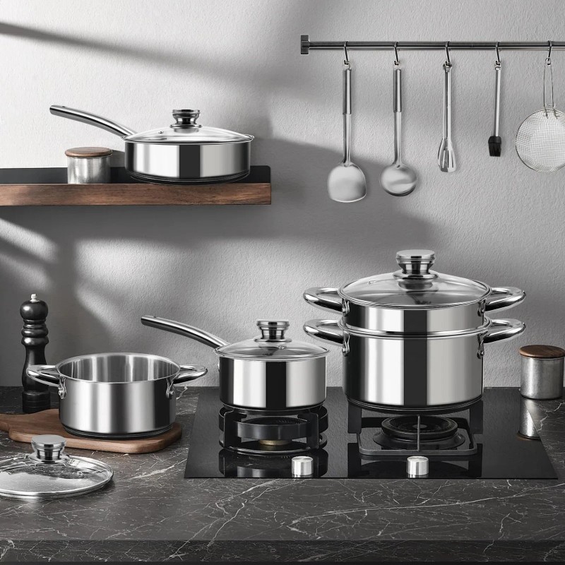 【Durable and Heat-Efficient Bottom Design】 Wodillo's pots and pans set features a thick, multi-layer stainless steel bottom for superior durability and even heat distribution, promoting energy efficiency and consistent cooking.