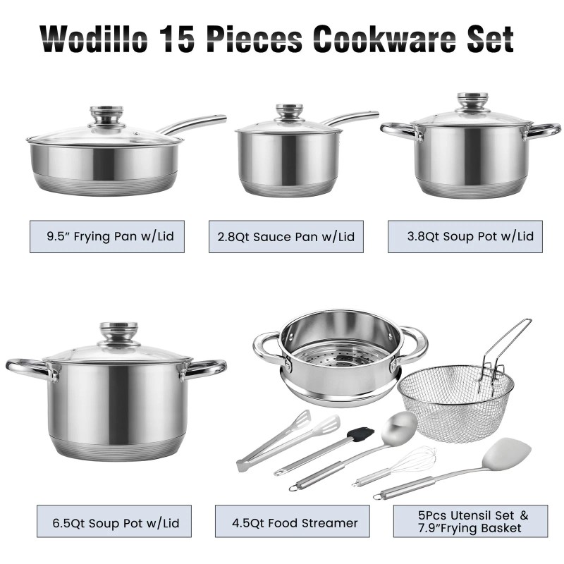 【Versatile Wodillo Pots and Pans Set】 The 15-piece set includes 2.8Qts sauce pan, 9.5”frying pan, 3.8Qt soup pot, 6.5Qt Soup Pot with 4.5Qt food steamer, along with frying basket and 5 piece of essential tools, covering all your culinary needs.