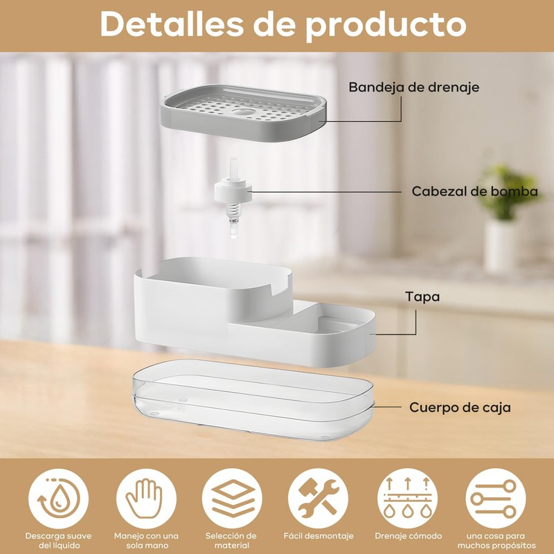 Nuestro dispensador de jabón con soporte para esponja y cepillo para platos con dispensador de jabón son la combinación perfecta. Mantén tu cocina organizada y eficiente mientras disfrutas de una limpieza impecable en cada plato. ¡La solución completa que estás buscando!