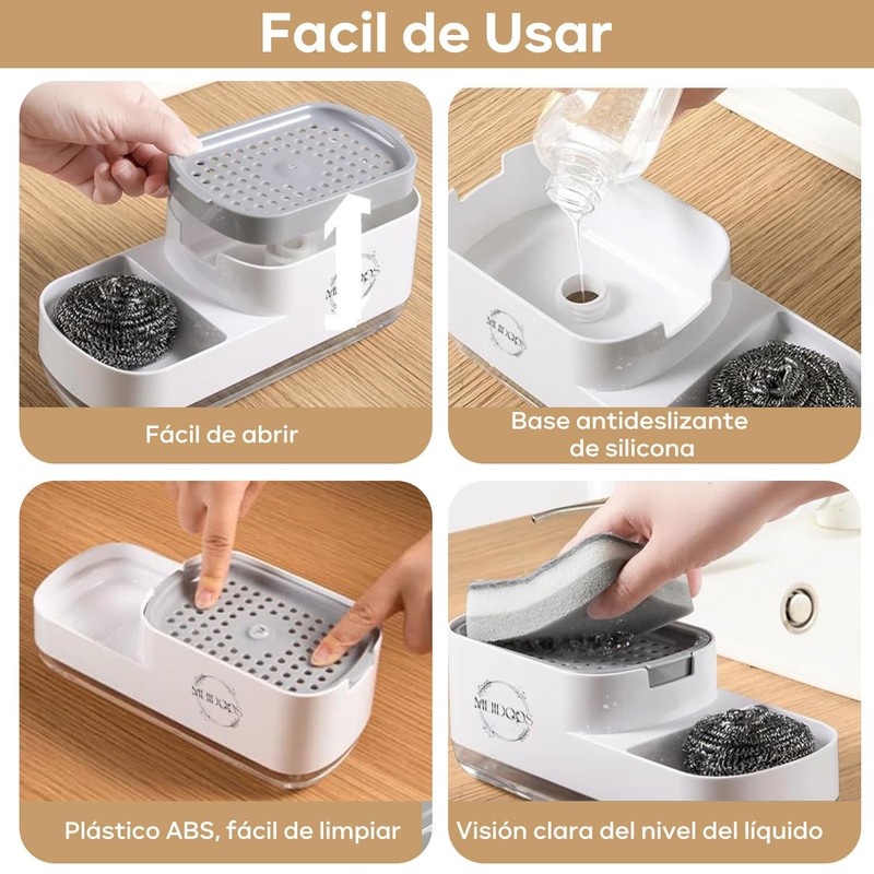 Olvídate de buscar utensilios de limpieza en la cocina. Con nuestro juego combinado de dispensador de jabón, esponja y cepillo, todo lo que necesitas está al alcance de tu mano.