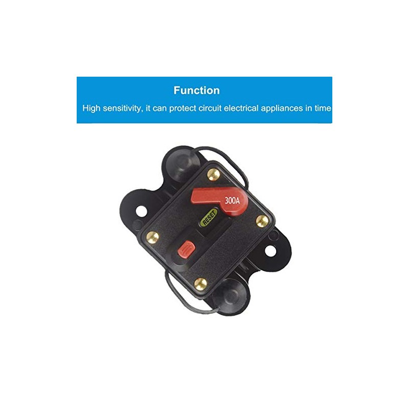 WOHHOM 30A 50A 80A 100A 150A 200A 250A 300A Circuit Breaker Reset Fuse Switch For Car Audio Marine (300A)A safe and convenient breaker for circuit of car stereo or large car electric appliance.Why need buy this circuit breaker?A: It can offers critical protection to your system -- No More Spending Money on Replacing Fuses.Suitable for car audio/video system, Boat, trucks, buses, RV's, ATV Winches and marine and DC sound amplifier system overload protection.Feature:1) Protect electrical appliances from excessive current.2) Made from alloy material of good electrical conductivity.3) High Tech water resistant housing.4) Manual control and easy to operate with manual reset arm5) Unique push button Reset can also be used as a kill switch.6) Mount on Panel or Firewall.7) Rubber Boots for water protection.Specification:Ampere: 300A.Models: 30A 50A 80A 100A 150A 200A 250A 300A (Optional).Voltage: 12-24V DC.Size: 3.4in (L) x 2.2in (W) x 1.5in (H).Material: Plastic + metal.Work Temperature: -10C to 50C (-14F to 122F).Package Includes:1 x 300A Circuit BreakerNote:1) Please shut down power before your replacement.2) Please correctly push the button to avoid damage the Circuit Breaker.3) Please order and use the Circuit Breaker with right work temperature, to avoid it is too heat and stop work.