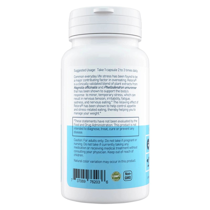 Relora® supports healthy cortisol levels already within normal range.* Common everyday life stress has been found to be a major contributing factor in overeating. Relora® is a clinically validated blend of plant extracts from Magnolia officinalis and Phellodendron amurense that has been shown to support the body's response to minor, temporary stress, which can result in nervous tension, irritability, fatigue, sadness, and nervous eating.* The relaxing effect of Relora® has been shown to help control appetite and stress-related eating, thereby helping you to manage your weightIf you are pregnant, nursing, taking any medications, or have any medical condition, please consult your healthcare practitioner before taking any dietary supplement