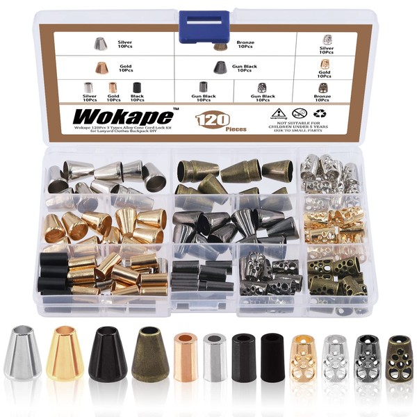 Wokape 120Pcs Alloy Cord End Lock Stopper, Hollow/Column/Bell Rope End Fastener Stopper Metal Drawstring for Bag Clothes DIY Lanyard