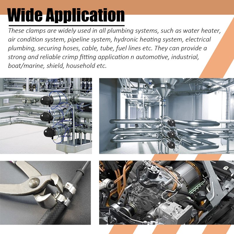 - ❥Wide Application----- These clamps are widely used in all plumbing systems, such as water heater, air condition system, pipeline system, hydronic heating system, electrical plumbing, securing hoses, cable, tube, fuel lines etc. They can provide a strong and reliable crimp fitting application n automotive, industrial, boat/marine, shield, household etc.
