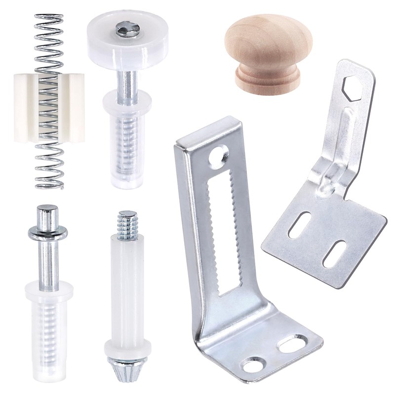 - 💥【What You Get】------- In this kit, You will get Bi-Fold Door Repair Kit. Inculding 2 pc top and bottom pivots, 1 pc 7/8" plastic guide wheels, 1 pc steel bottom pivot bracket, 1 pc wood knobs, 1 pc white plastic tighteners with steel springs pin, 1 pc steel aligners and fasteners for all components. Our kit will meet your needs of repairing wardrobe door tool.