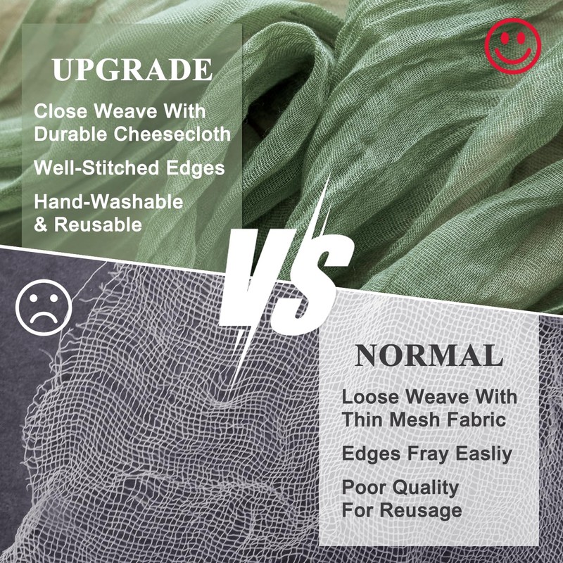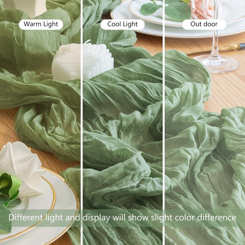 - 【Cheesecloth Table Runner】 You will get 3 pieces, 35" Wx120" L(10ft)length sage green table runner. The boho table runner are designed with textured gauze fabric, which is not easy to fade, does not shrink, has elasticity, and its length is enough to span a large table.