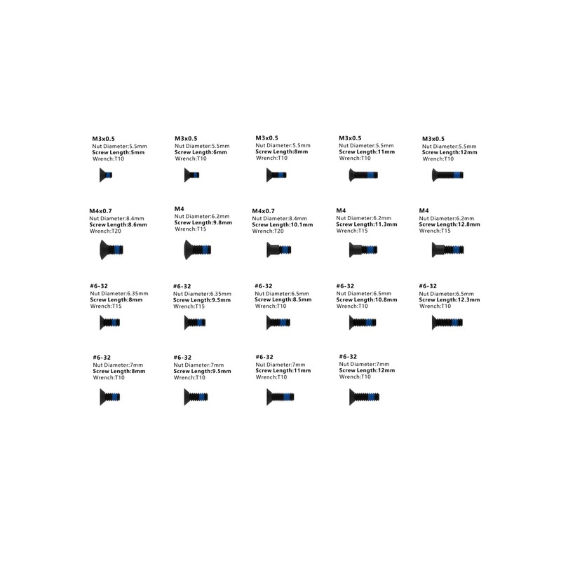 - Wokonl Red Dot Mounting Screws Kit includes 19 precision screw sets (M3, M4, #6-32), each screw type includes 3 pieces (57 pieces total), providing a spare for lost or damaged screws.