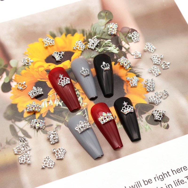 - 【3D Crown Charms For Nails】: Package Content 30 Pcs alloy silver crown nail charms with different color rhinestones designs, 5 pcs for each design. Shinny and fit for plenty of nail art designs