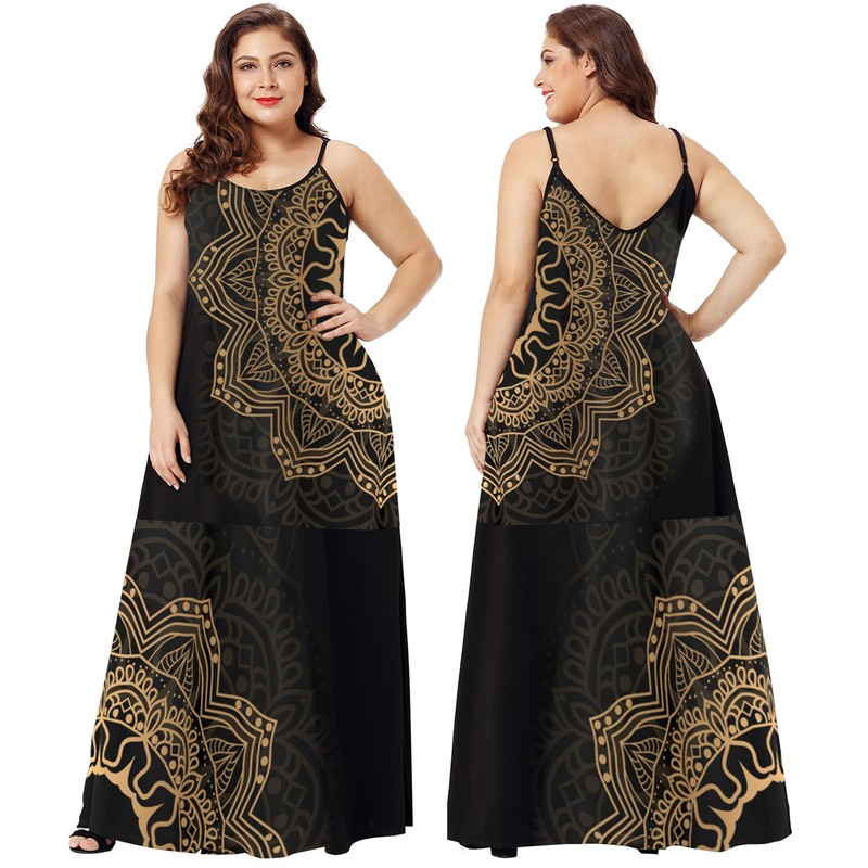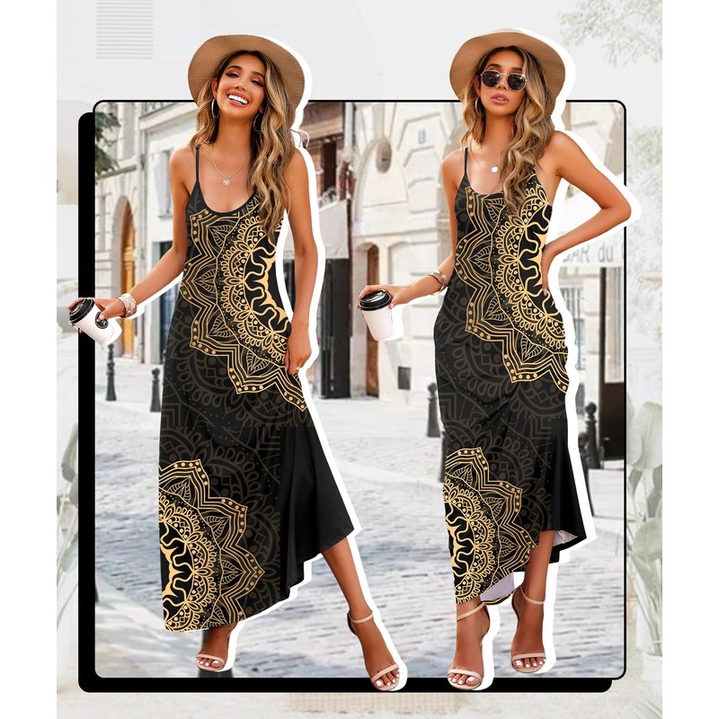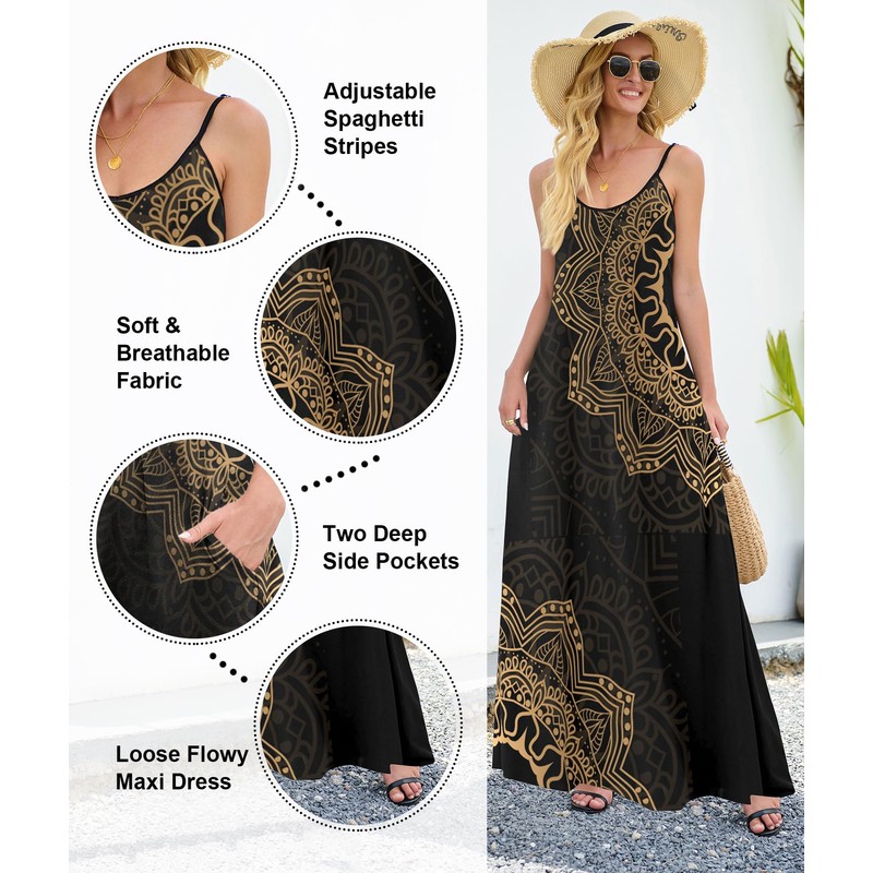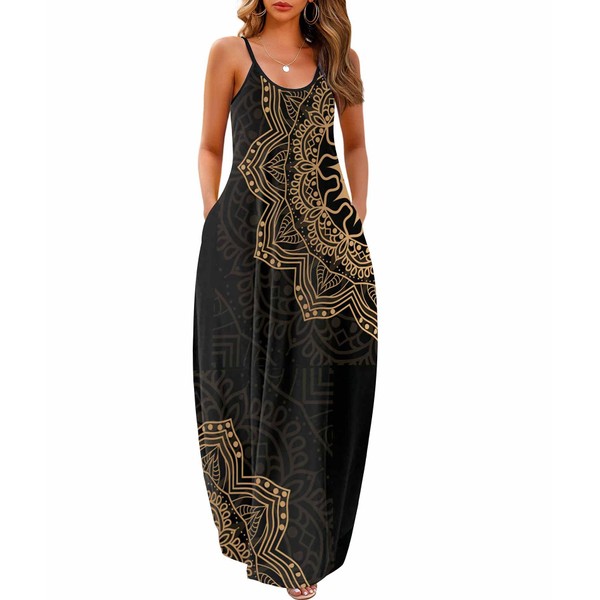 Wolddress Womens 2024 Casual Sleeveless Sundress Plus Size Loose Plain Long Summer Beach Maxi Dress with Pockets Mandala Black S