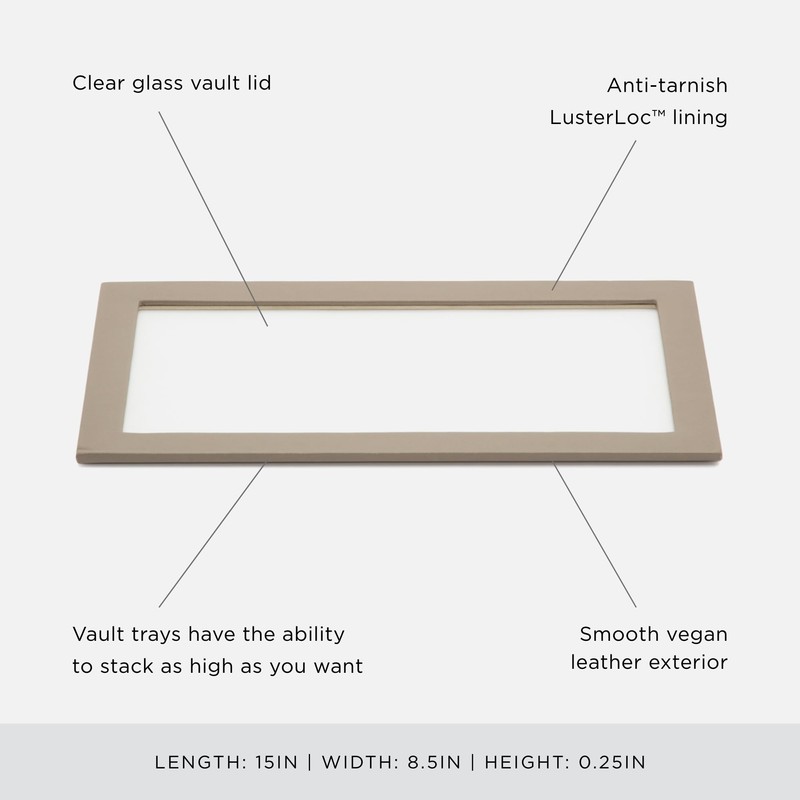 - VAULT TRAY GLASS LID - Let your jewelry sparkle through the clear glass of this classic vegan leather tray lid. It fits neatly into all stackable VAULT trays.